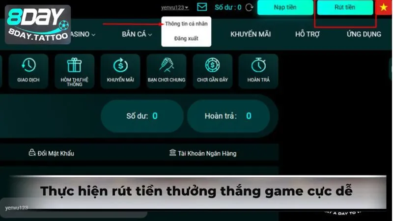 Rút tiền 8day không chỉ đơn thuần là việc giúp người chơi thu về thành quả sau những ván cược thành công. Mà hình thức này còn giúp phản ánh về mức độ tin cậy, chuyên nghiệp của nền tảng đối với cộng đồng của mình. Thành viên muốn rút thưởng về tài khoản riêng của mình khi thắng, hãy theo dõi bài thông tin dưới đây.
